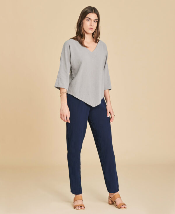 Blouse ample et légère en gaze de coton, dotée de manches longues à emmanchures basses et d’un élégant col bateau rehaussé d’un biais. Sa base asymétrique, incurvée à l’avant et légèrement arrondie à l’arrière, vient adoucir le vêtement par sa courbe.