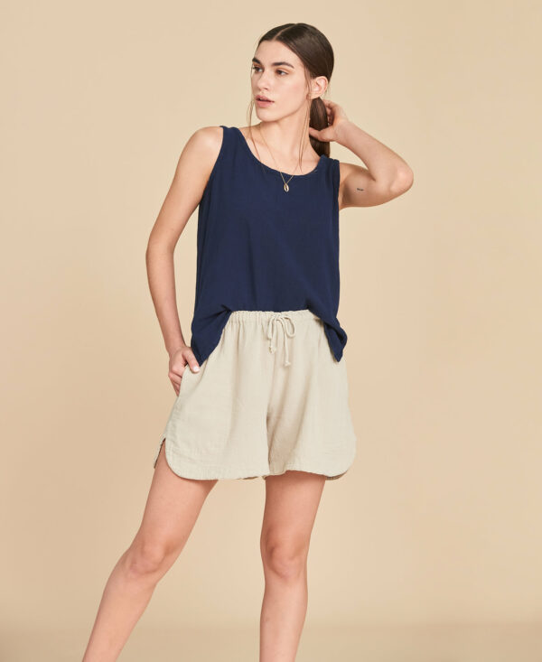 Débardeur en coton doté d’une coupe droite et ample. Ses larges bretelles, son col U dégageant le cou et sa base ouverte par de petites ouvertures latérales en font un basique des plus confortables.