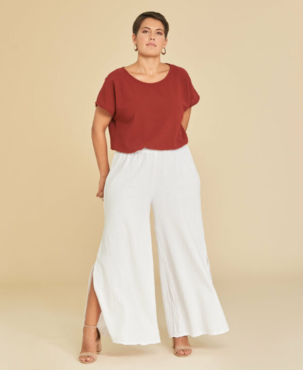 La plupart de nos modèles ne sont pas ajustés et offrent une coupe généreuse et fluide. Nous garantissons une aisance pour toutes les morphologies grâce à nos quatre tailles bien pensées. Les ceintures sont toujours élastiquées pour plus de confort.