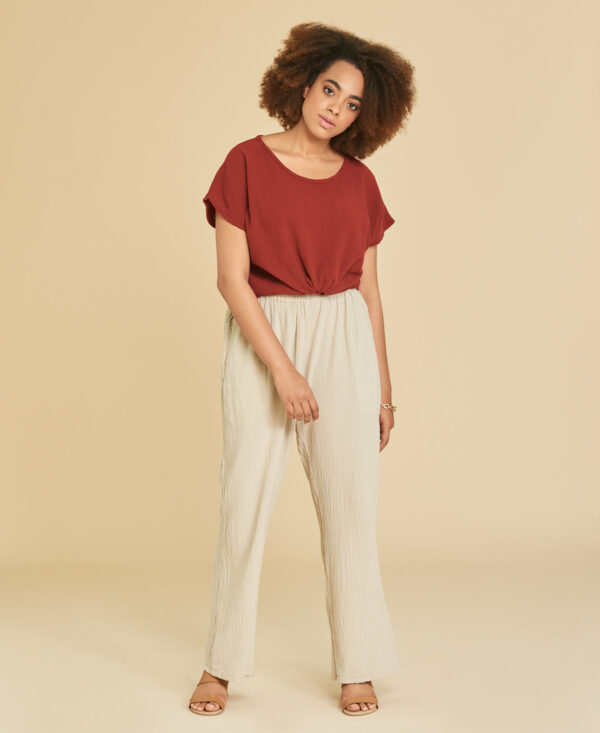 Pantalon ⅞ fluide en coton, terminé aux chevilles par de larges ourlets entaillés sur les côtés. Sa taille haute plissée et resserrée par un élastique et ses deux grandes poches pratiques situées au niveau des hanches, dans les coutures latérales, apportent du volume et de l’aisance à ce pantalon.