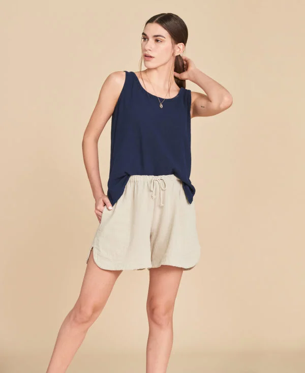 Robe courte en coton, dotée de manches courtes et d’un col rond rehaussé d’un biais. Sa coupe droite et ample se termine à la base par un arrondi à l’avant et à l’arrière. Cette robe légère est des plus agréables pour les saisons chaudes.