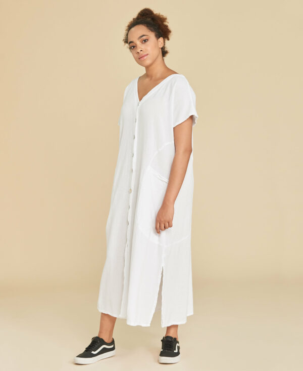 Robe mi-longue en coton à manches courtes et col V échancré garni d’une parementure. Un étroit plastron à l’avant et à l’arrière vient structurer le haut de la robe qui s’étoffe ensuite grâce aux plis en creux situés à l’avant et à l’arrière, apportant ainsi de la fluidité et du mouvement à la jupe se terminant en arrondi.